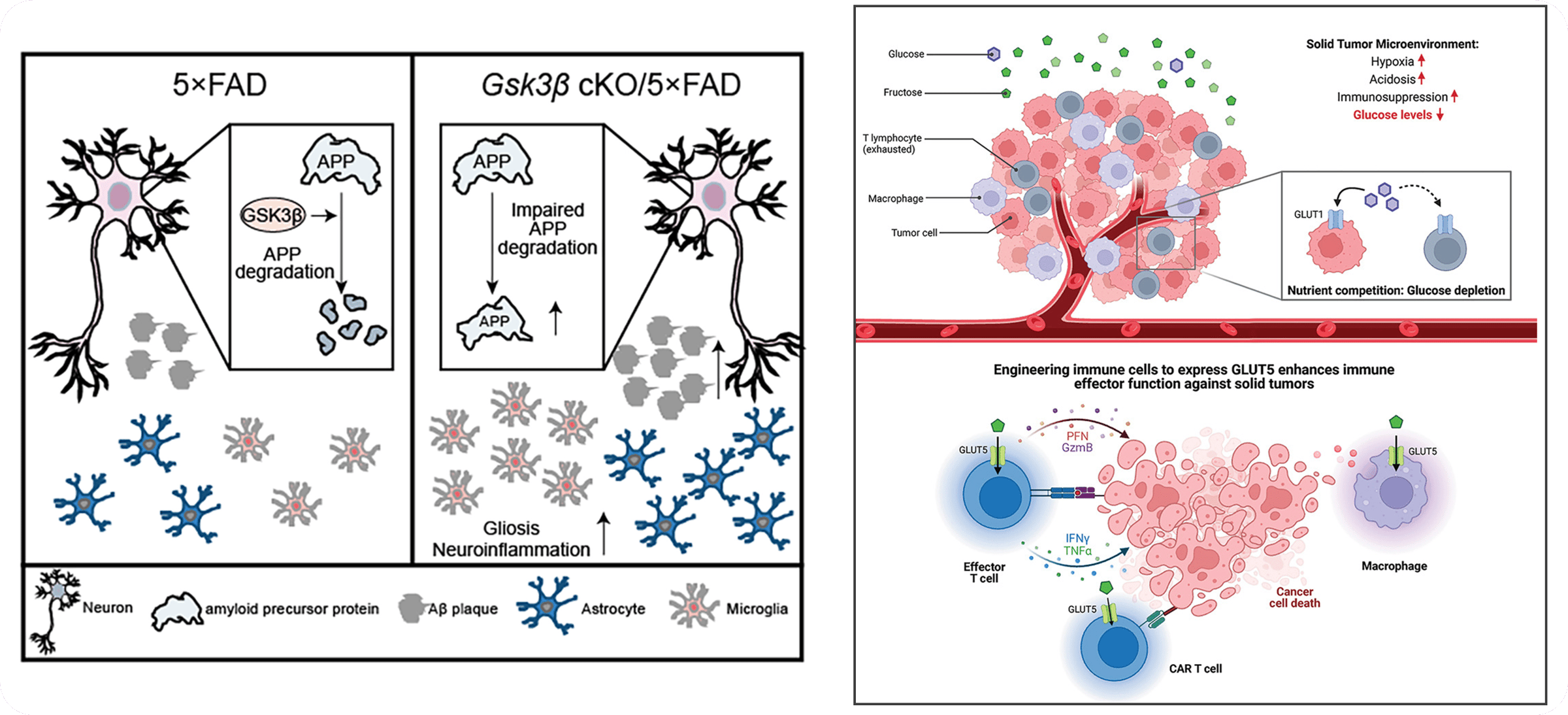 The graphical abstract on the right is very interesting because it leverages the idea of visualizing numerical changes. However, adding a legend already hints at a shortcoming, which becomes especially apparent with the amyloid precursor protein. Your reader should intuitively understand what is being displayed. Secondly, it is obvious that certain elements have simply been copy-pasted. Pro tip: rotate them or slightly adjust their width to create a more natural appearance - it sounds simple, but it does wonders. For the example on the right, we find the label “cancer cell death”, but the apoptotic bodies and dissolving mass already communicate this very effectively.