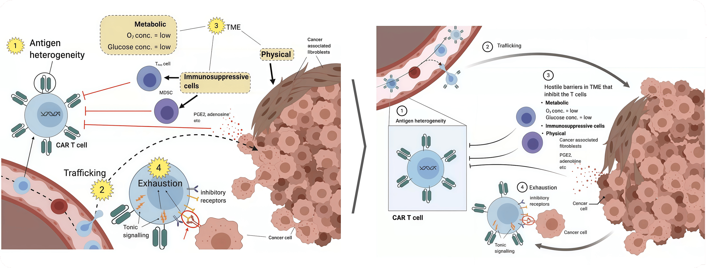 This is an example from the BioRender webinar in which the very confusing layout on the left was improved in the version on the right. You can see how the aspects associated with numbers (e.g., “antigen heterogeneity”) are significantly larger than the text in the boxes or the cell labels, which makes the design look clumsy. However, even in the “improved” version, the T-cell receptor interaction is much smaller than any other element, causing you to almost gloss over it. The red circle does not really help; instead, it detracts from the scientific design. By reducing the size of the tumor mass and removing other receptors from the cell surface, more space could have been created to enlarge this element, thereby improving both the design and the readability.