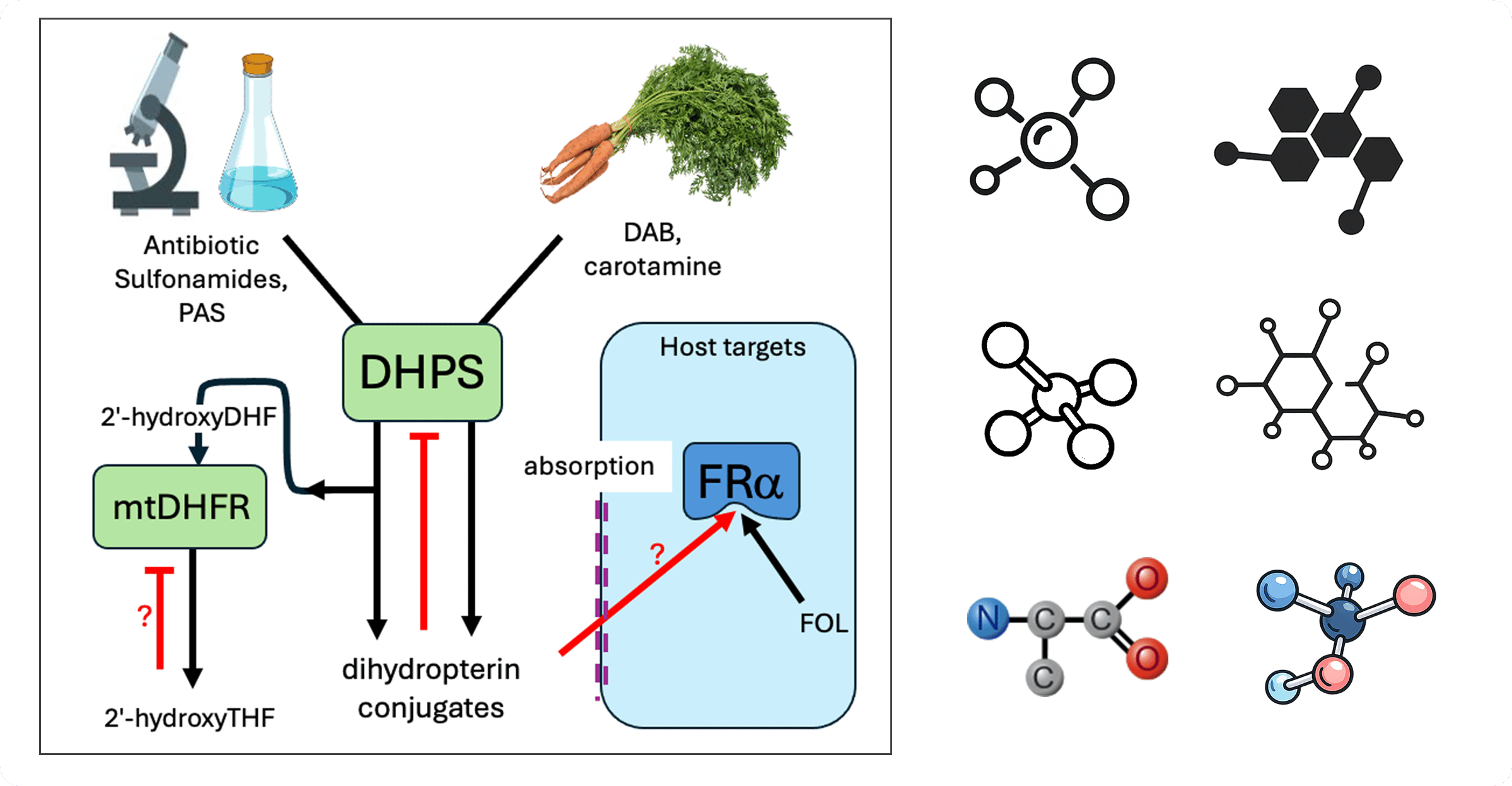 The graphical abstract is a good example of icon choices that are neither visually appealing nor well-suited to the design. The simplistic design of the text elements does not match the 3D icons, and the 2D microscope is in stark contrast to the picture-like display of the carrots. Moreover, the arrows are inconsistent too. On the right, I have assembled a few examples of icons for “molecule” to demonstrate how different the styles can be.