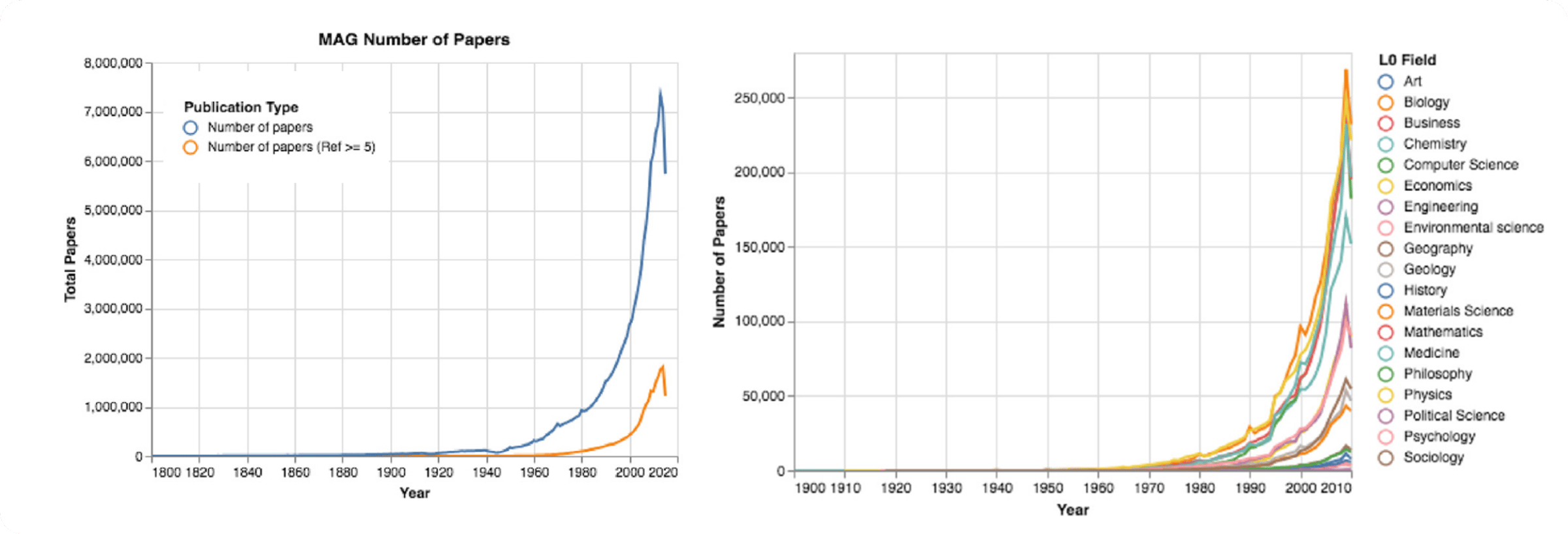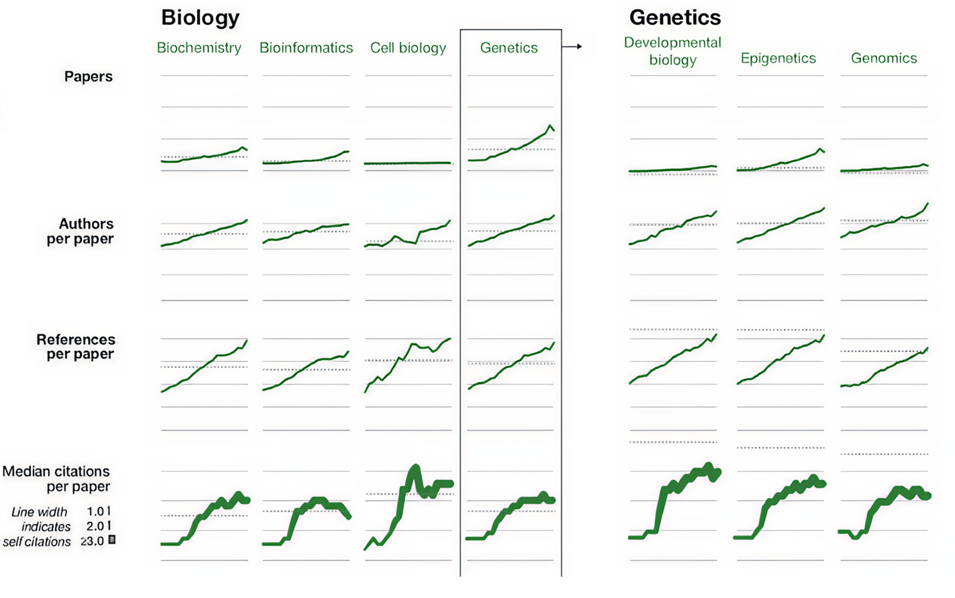 Click to enlarge. Fire & Guestrin state that in most journals the number of papers with one or more authors who previously published in the journal increased sharply. The authors summarize their (truly interesting) findings as “Our study shows that the validity of citation-based measures is being compromised and their usefulness is lessening. In particular, the number of publications has ceased to be a good metric as a result of longer author lists, shorter papers, and surging publication numbers. Measures such as a journal’s impact factor have also ceased to be good metrics due to the soaring numbers of papers that are published in top journals, particularly from the same pool of authors.” (There is a decline in the number of papers after 2014, probably due to missing papers in the MAG dataset, which was released in 2016.) They analyzed >120 million papers with a deeper look into biology.