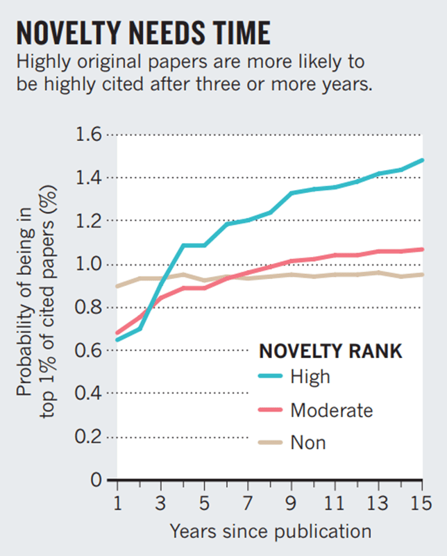 Although only required by a few institutions, applicants often include JIF to denote the “value of their publications”. In practice, this is also frequently encouraged by their institutions. However, some argue that chasing high-profile publications pushes scientists into highly competitive topics and may encourage cutting corners or overstating results. The authors claim the deeper issue is that short-term metrics (like JIFs and citation counts) discourage risky, innovative research. To examine this, they analyzed over 660,000 papers from 2001 in Web of Science, using an indicator of “riskiness” based on whether a paper cited unusual new combinations of journals in its references.