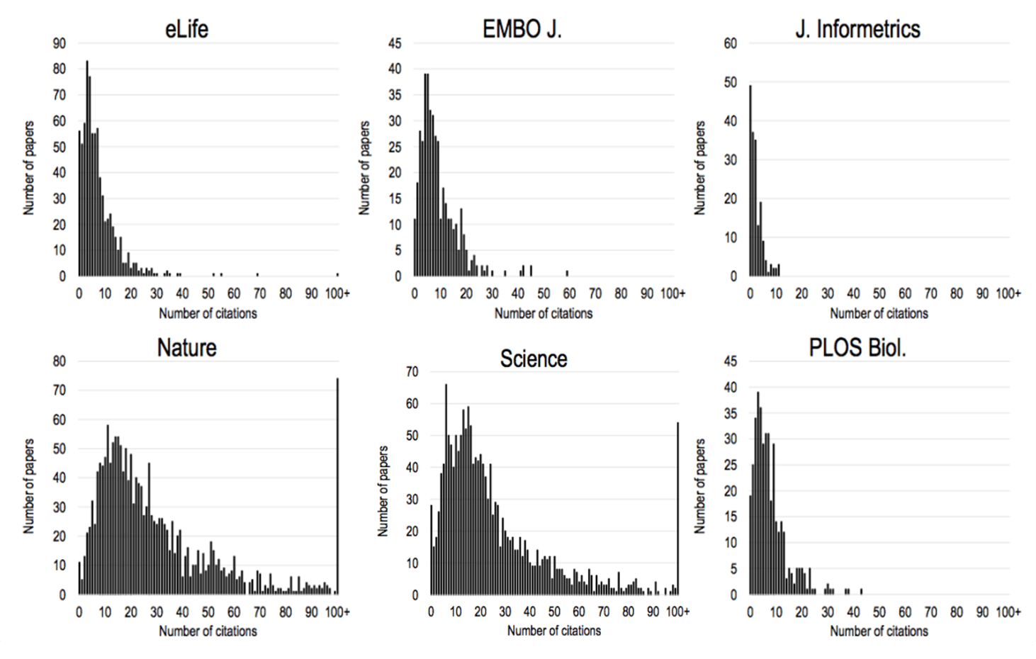 These figures originate from an older preprint, but similar patterns have been reported in other analyses. The citation distributions represent citations received in 2015 for citable documents published in 2013 and 2014, making them comparable to the 2015 Journal Impact Factors released by Thomson Reuters. To enable direct comparison across journals, all distributions use the same citation range (0–100). Articles that received more than 100 citations are grouped into a single bar on the far right of each plot.