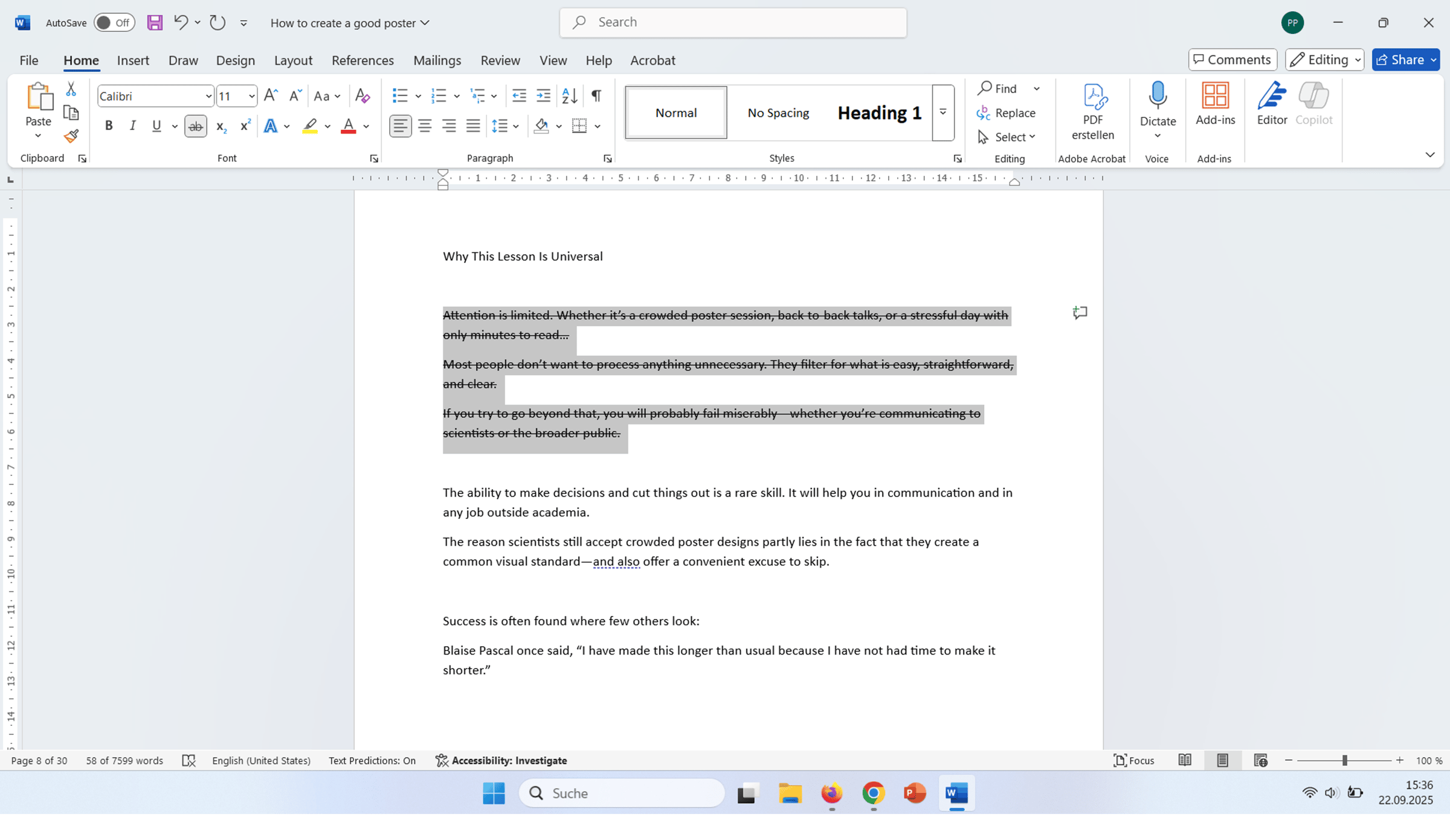 Click to enlarge. I often end up cutting half of my original script and a third of the edited version. Yes, that is quite a lot - but having people read the most essential parts of your work is far better than having nobody read it at all. In the example above, you can see what I would have cut—until I decided to leave this section out entirely. Painful? Yes…