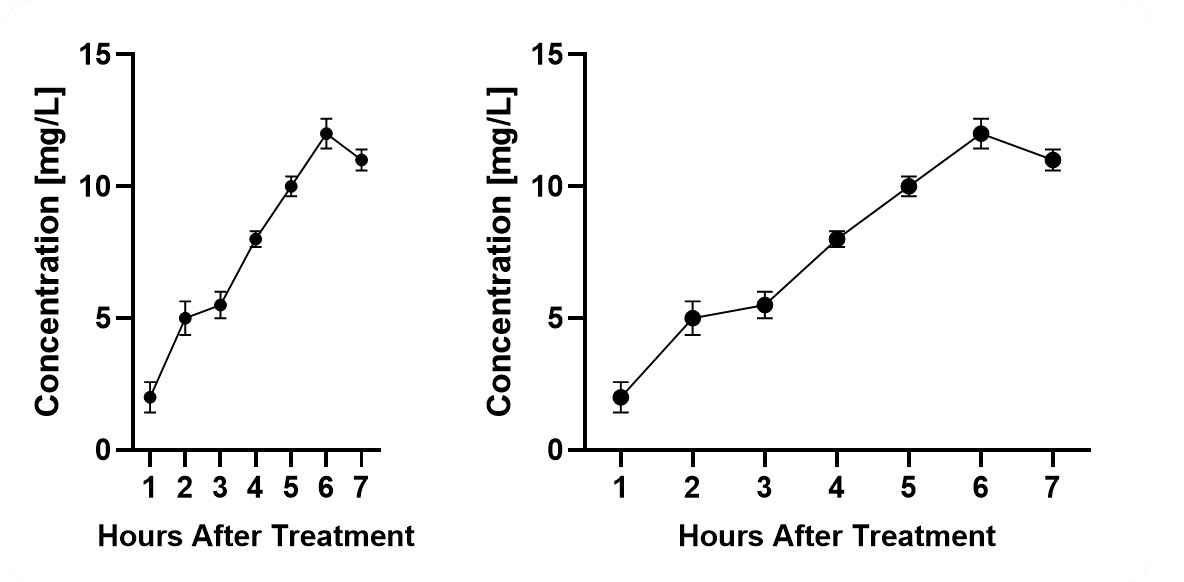 When it comes to curves, consider that the spacing of your x-axis has an important impact on the perceived slope of your graph. Again, there is no way around this. Also consider that the perception of your error bars will vary with the size of your graph. In both cases, mean values ± SD are displayed.