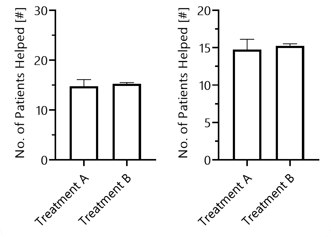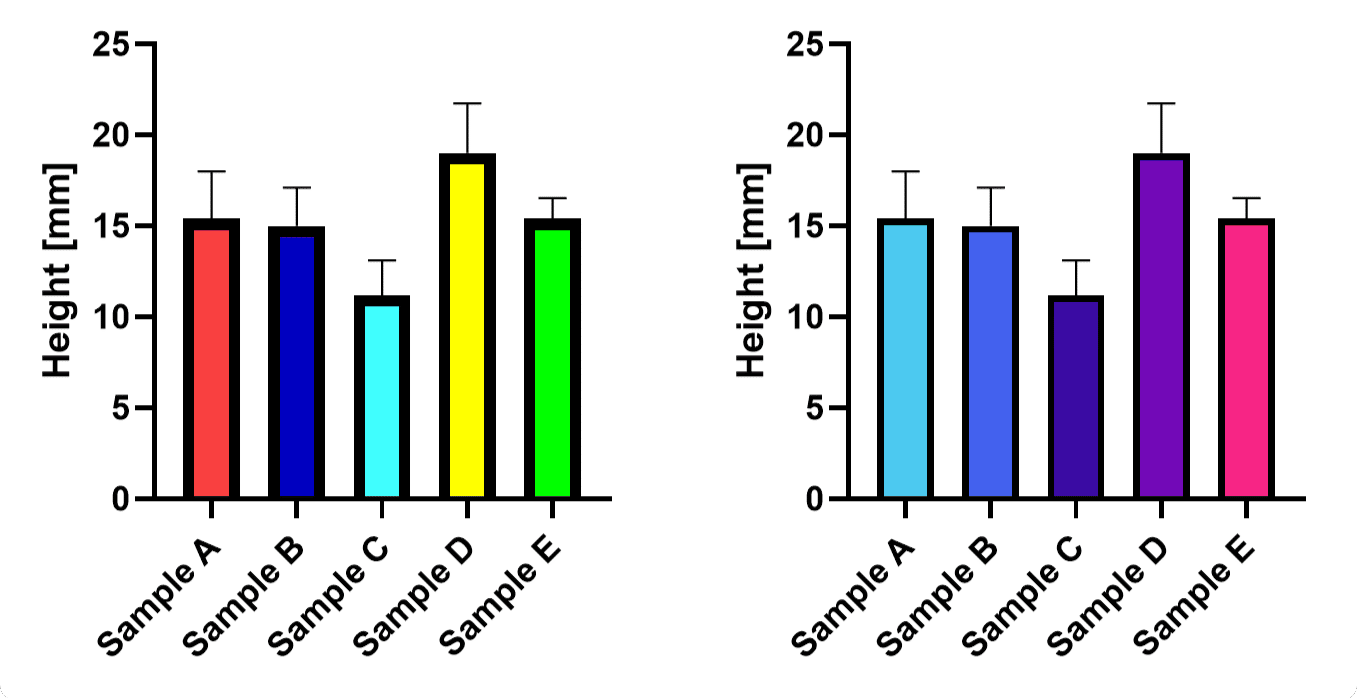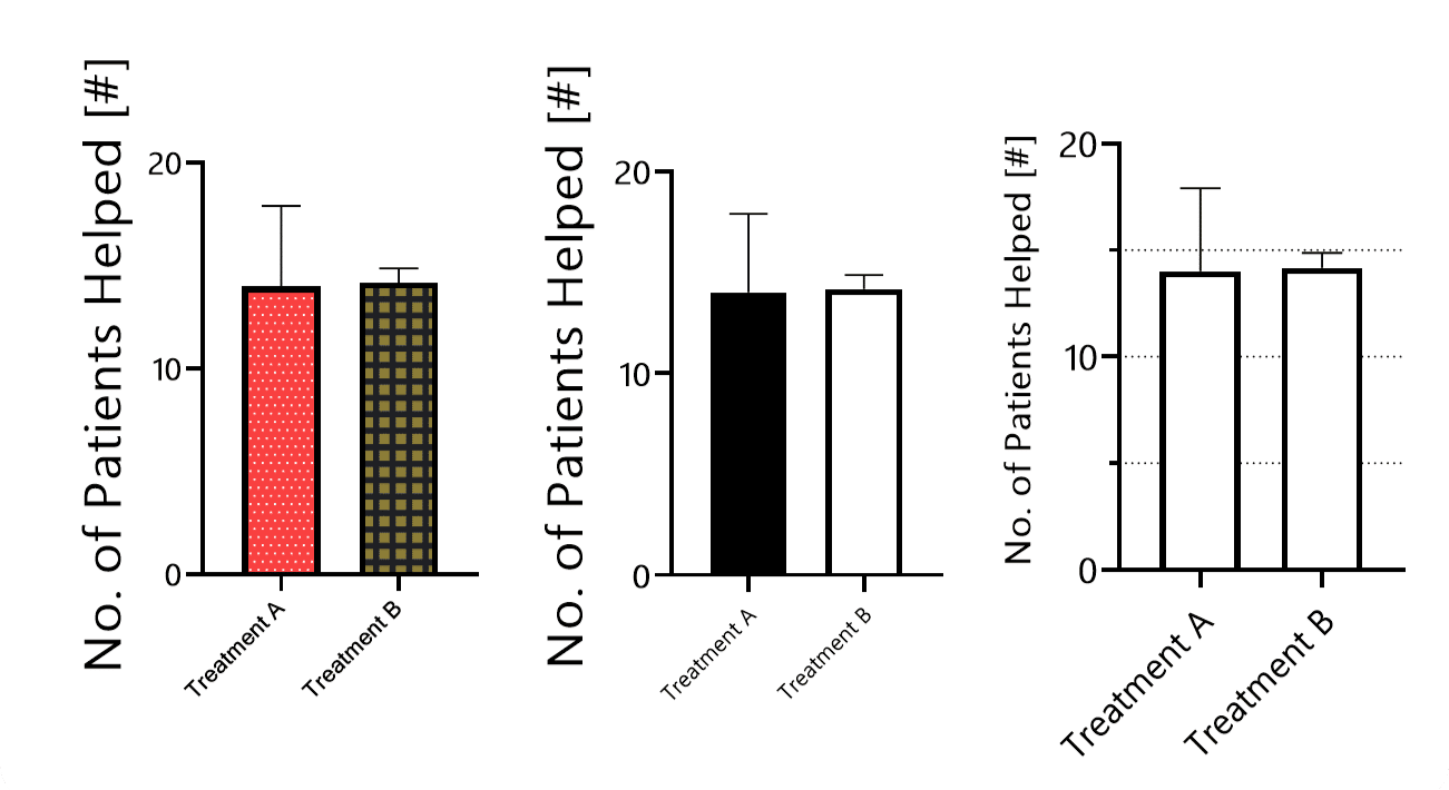 Displayed are mean data ± SEM with 6 data points. Obviously, the graph on the very left makes it extremely hard to focus on the data. However, even the center one is visually distracting, as the y-axis label is much too large, and the strong black–white contrast of the bar filling makes it hard to see whether one bar is higher than the other. Although I think we could even optimize the one on the very right by adding data points and switching to SD, it overall allows for the best assessment.