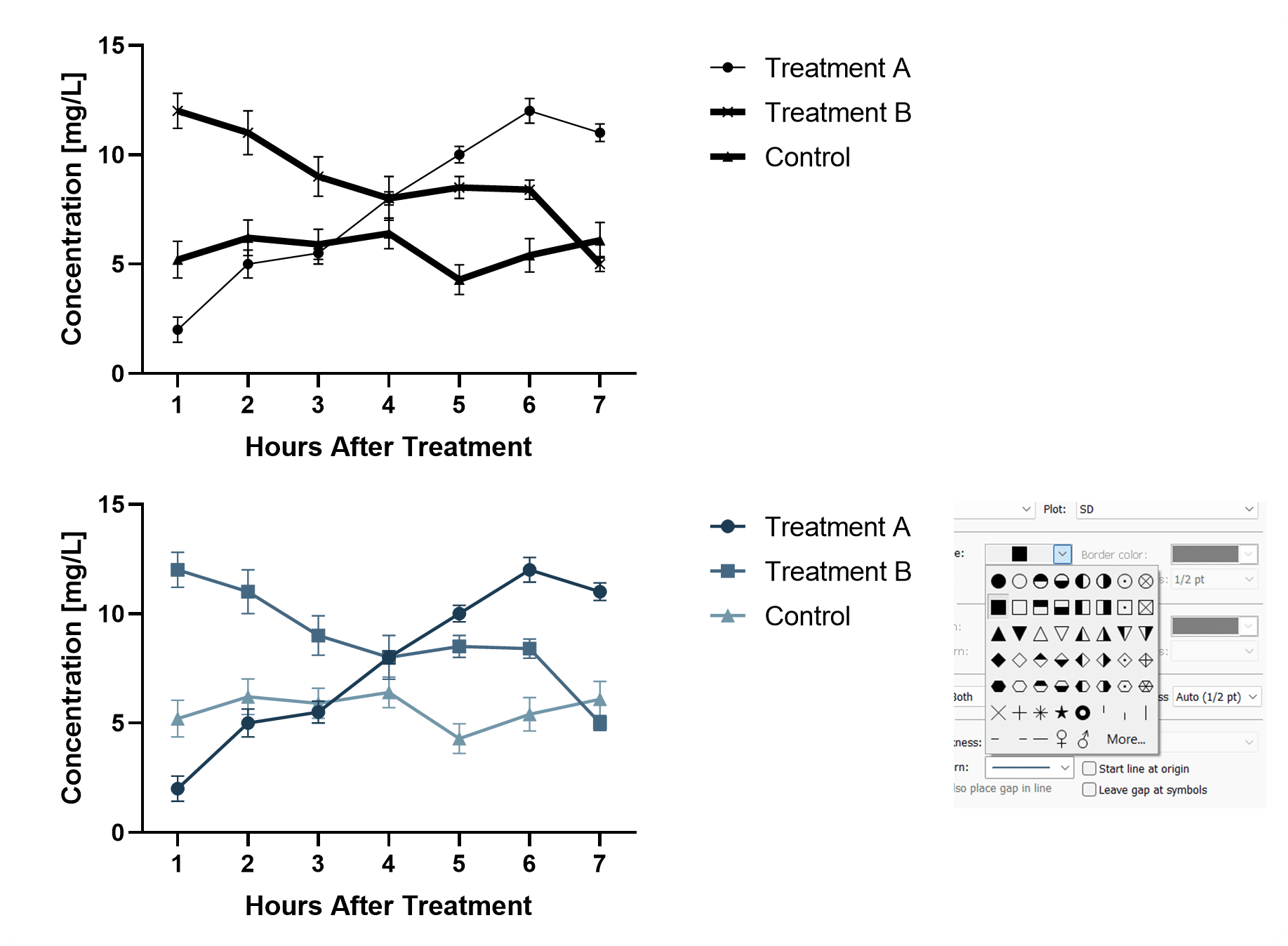 Whereas in the upper figure the bold lines are so thick that it becomes hard to see the error bars, the thin ones can be harder to track for those with poorer vision. Of course, color is not a necessity, but it can help to trace lines when, as in this example, they cross each other multiple times. Please also note that the size and type of symbols were changed - make them large enough and try to keep them consistent. There is a reason why, as in the panel taken from Prism, they are arranged in a certain order, it can sometimes guide you in your choice.