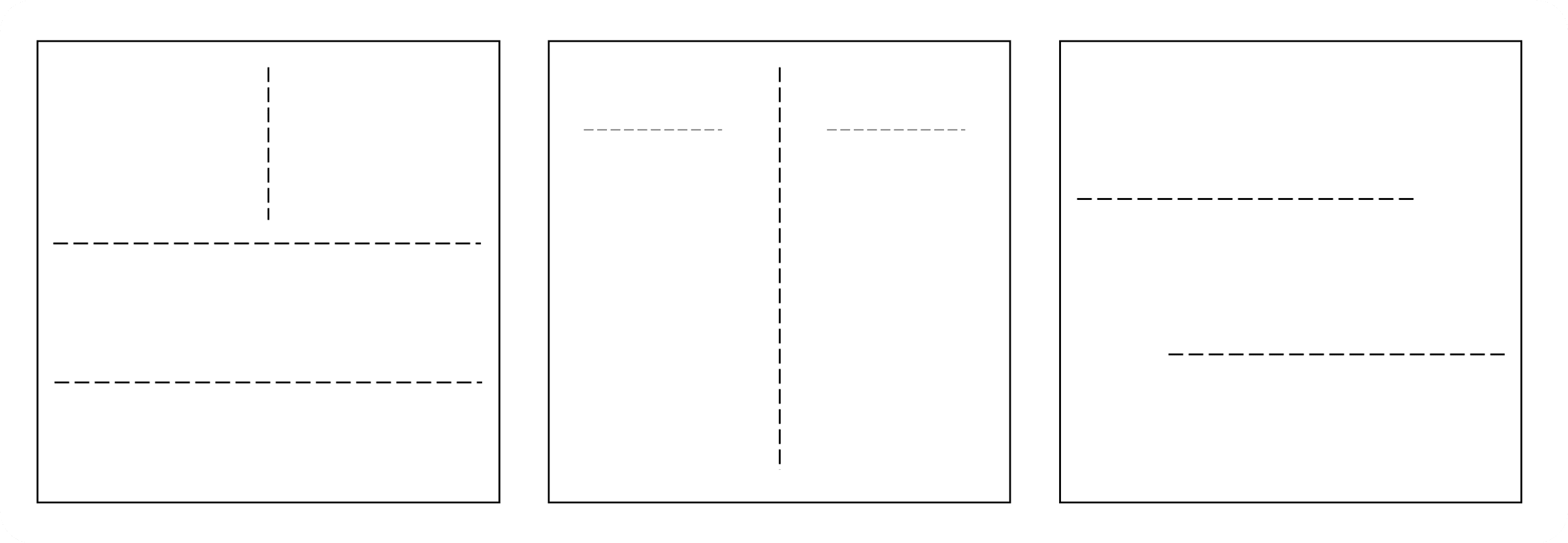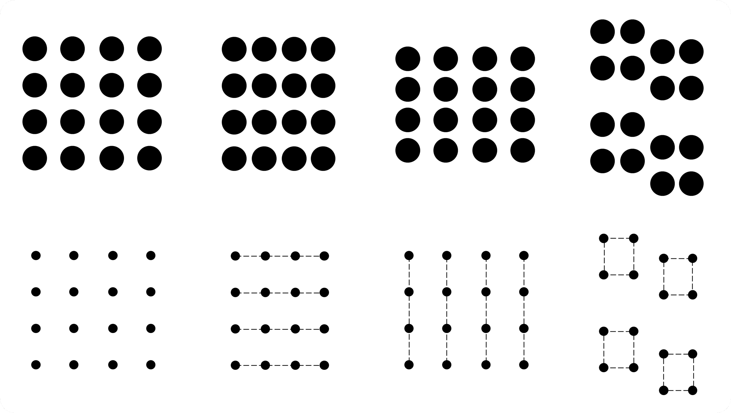 While the example on the far right is quite clear, if you look at the one in the middle, it is really the smaller left-to-right distance compared with the bottom-to-top distance that makes the brain group the elements into stacks. The theory behind this is described by Gestalt theory (in case you want to dive deeper).