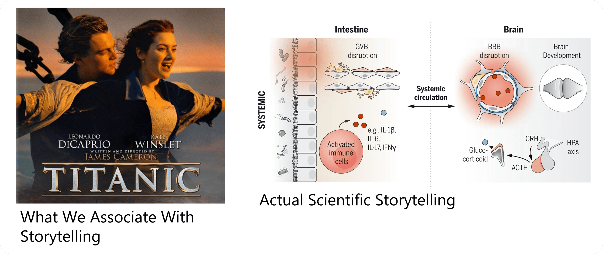 Watch this as inspiration for scientific storytelling. Whether it is salt causing hypertension, mutations causing cancer, or caloric excess causing overweight, there are several stories that have succeeded in science. It doesn’t matter whether they are true or not—observe what makes people so attracted to them. This is what you need to do in your poster as well. The picture on the right illustrates the gut–brain axis and how inflammation influences mental states such as anxiety.