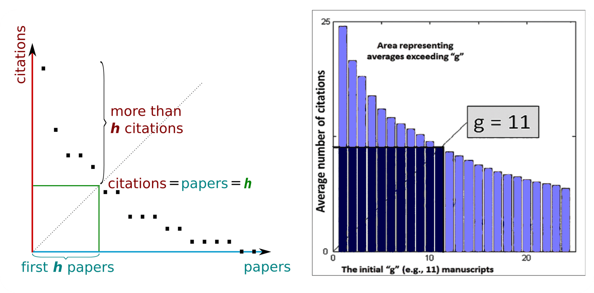 As you might have noticed, the g-index is an alternative to the older h-index. The point is that the g-index gives more weight to highly cited papers. In more detail, the h-index does not average the number of citations. Instead, it only requires a minimum of n citations for the least-cited article in the set and thus ignores the citation count of very highly cited publications. Interestingly, mathematically the g-index turns out to be the maximum reachable value of the h-index if a fixed number of citations can be distributed freely over a fixed number of publications.