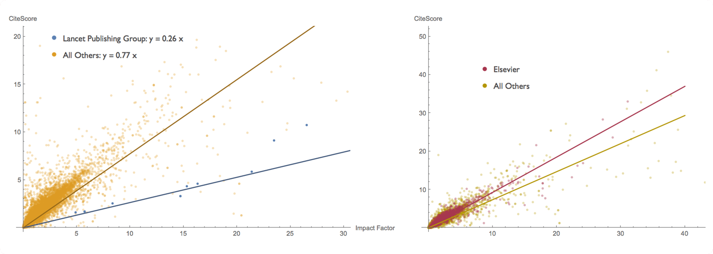 Click to enlarge. In one of their blogs, Eigenfactor conducted a rough analysis of CiteScore results because when Elsevier launched CiteScore (via Scopus), it was positioned as an alternative to the Journal Impact Factor from Clarivate.