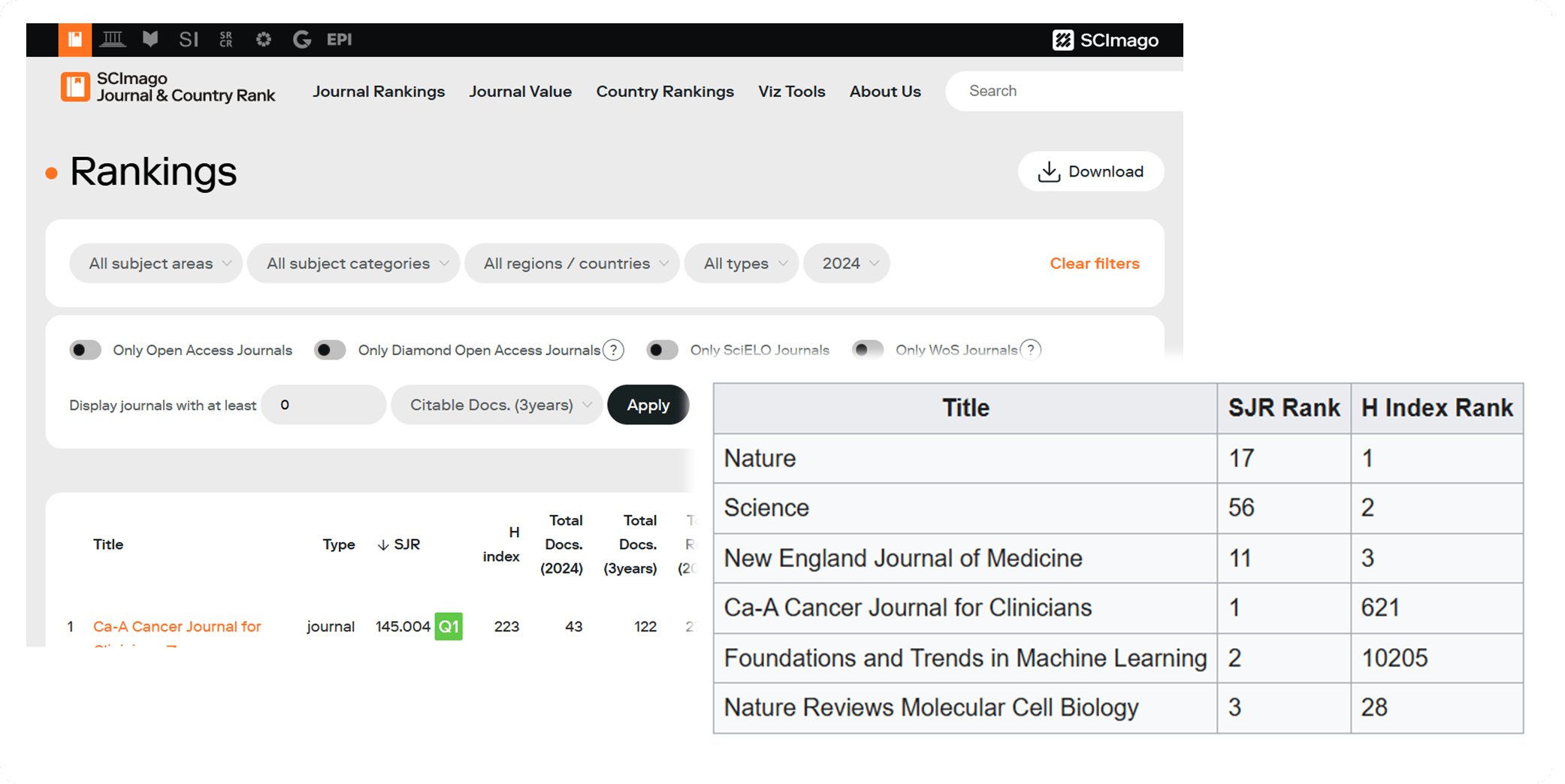 In SCImago Journal Rank (SJR), citations are weighted using a PageRank-style algorithm in which each journal passes a share of its prestige to the journals it cites, similar to PageRank, originally developed by Larry Page and Sergey Brin at Google (if you like to read more about how it works). However, as shown in the graphic above, this leads to clear differences when comparing SJR rankings with rankings based on the h-index (taken from Wikipedia), which measures the largest number of papers that have each received at least that same number of citations (more on this below).