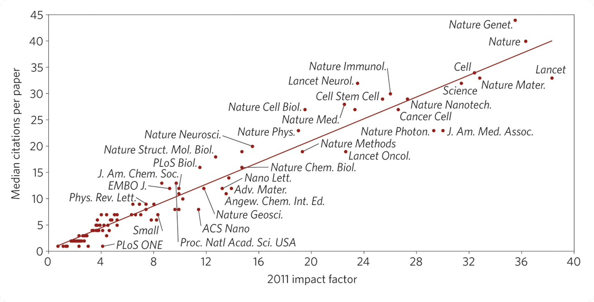 This editorial from Nature Materials addresses criticisms of the journal impact factor such as the short two-year citation window, and distortion by highly cited papers. It contends these concerns are overstated, presenting data showing that the 2011 impact factor correlates well with the five-year median citations of primary research papers, a measure robust to outliers and excluding non-primary content.