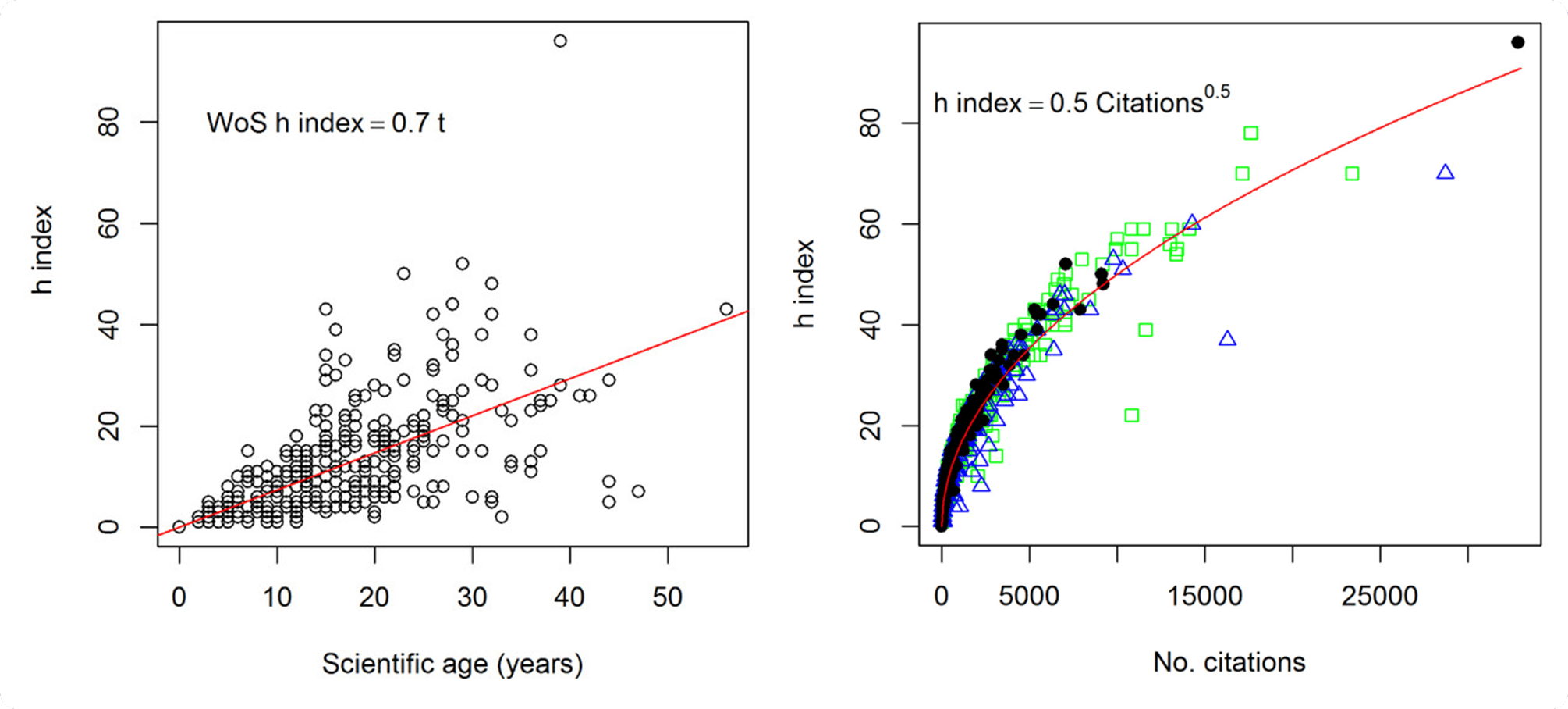This is data from Minasny et al. showing the relationship between the scientific age (t) of 340 soil researchers and the h index (Web of Science data) on the left and the relationship between the number of citations and the h index on the right (Black dots are data from Web of Science, green squares are from Scopus, and blue triangles are from Google Scholar.) For more on the h index, read this editorial.