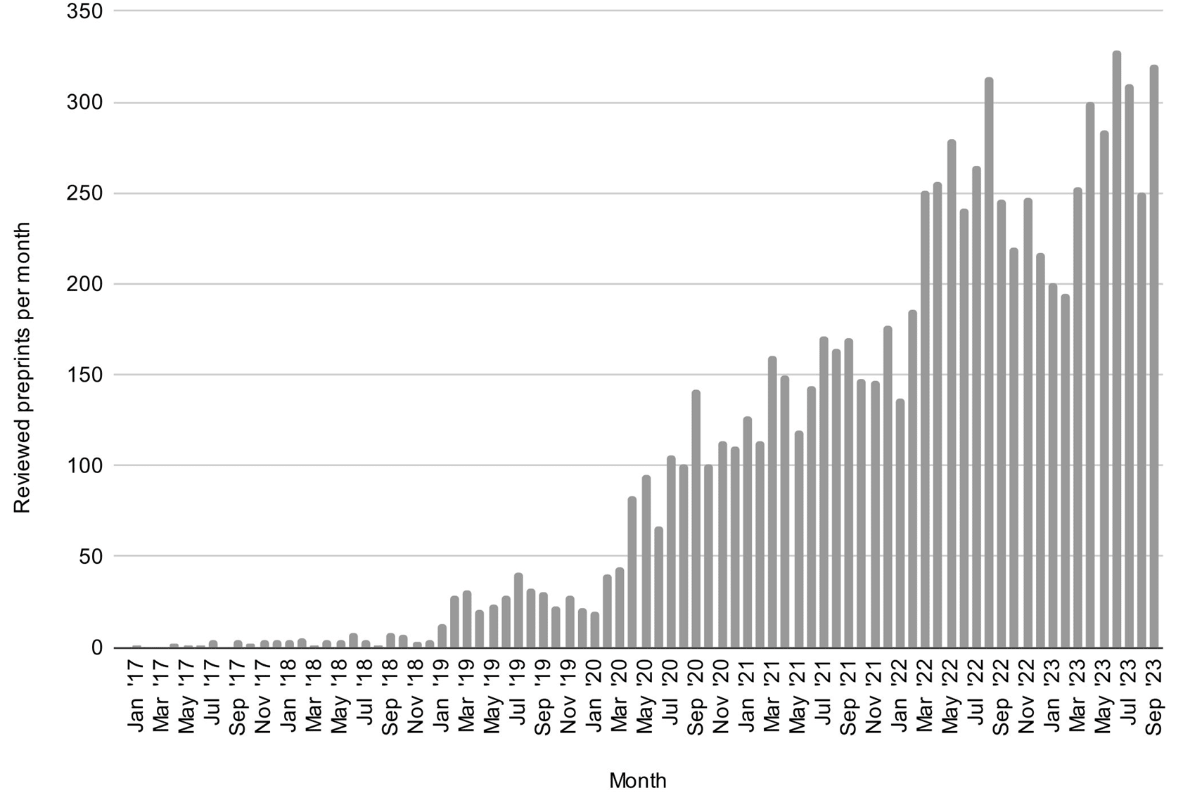 This graphic stems from Avissar-Whiting et al., quantifying the number of preprints published every month.